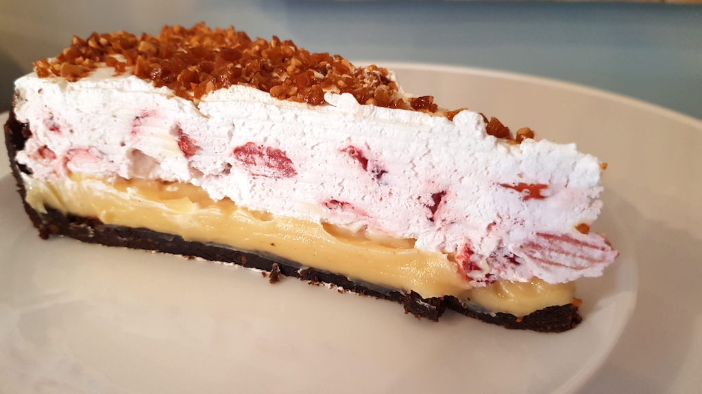 Morangoffe, massa de bolacha de chocolate, creme de leite, leite condensado e chantilly