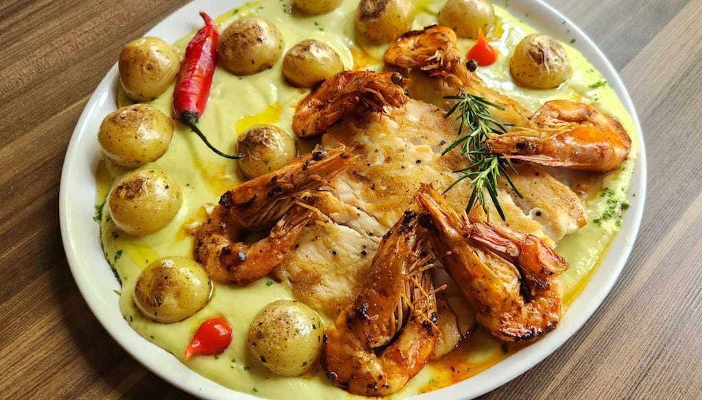Robalo Grego: filé é salteado no azeite com camarões sobre creme de aspargos frescos e mini batatas douradas