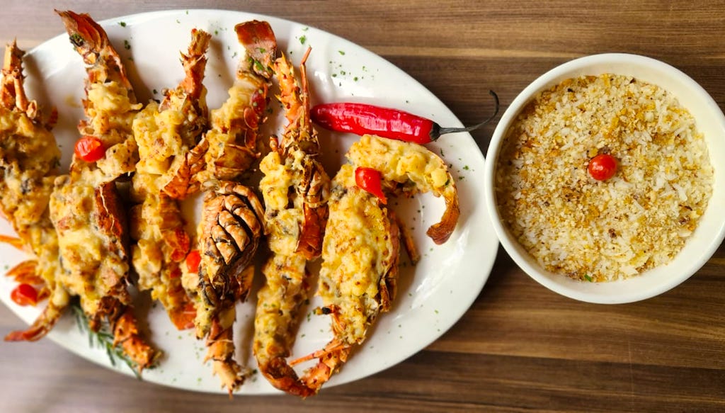 No restaurante da chef Thaísa de Mello, as lagostas são estrelas. A Santorini é flambada no conhaque com creme de natas, cogumelo fresco e gratinada com queijo gruyere. Para acompanhar, arroz crocante de frutas secas.