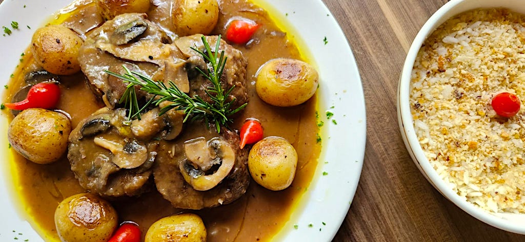 Filé a Valentina é preparado na chapa, regado ao molho de vinho marsala e cogumelos frescos com mini batatas douradas e arroz douradas