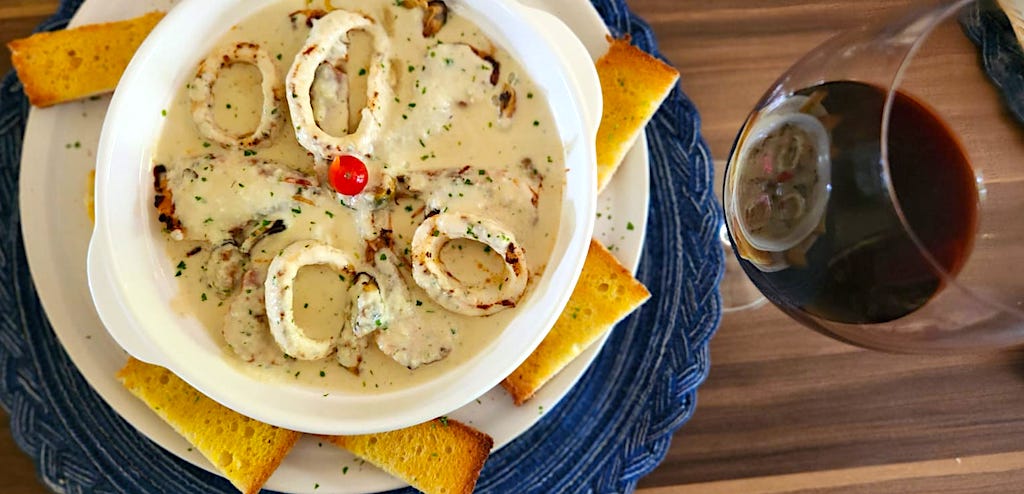 O molho a base de vinho Sauvignon blanc embriaga os camarões, lula e mexilhões, e vem com torradas para mergulhar