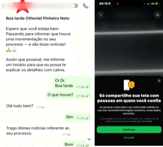 "Eu já sabia que esse golpe estava sendo aplicado na praça. Utilizando-se da imagem do advogado verdadeiro, os golpistas acessam informações preciosas e verdadeiras dos processos judiciais, conseguem os telefones das vítimas e, com essas informações privilegiadas, eles repassam afirmando que a pessoa ganhou o processo na justiça e usam a foto do advogado verdadeiro. Na pressa e, às vezes, com muita ansiedade em receber o valor, a pessoa acaba acreditando", comentou Othoniel.