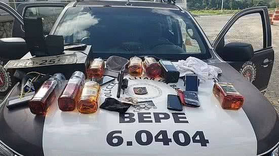 Ainda de acordo com nota da PM, os três bandidos foram levados para a Central de Flagrantes, para registro da ocorrência. Com eles foram encontrados oito litros de whisky, celulares, um relógio amarelo, uma quantia em dinheiro, uma caixa registradora ainda fechada e duas placas de carro. Todo o material foi apresentado a delegacia.
