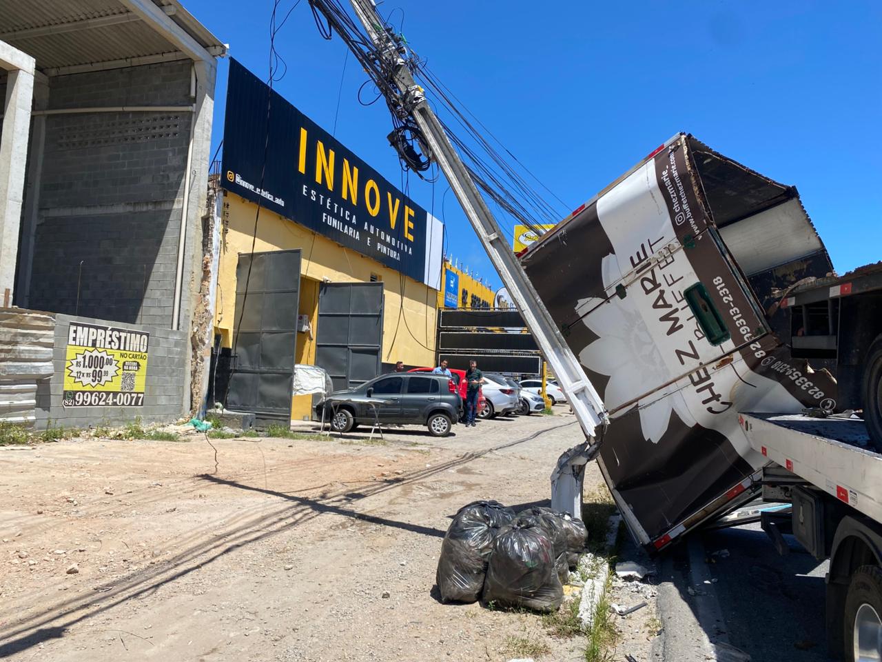 O baú de um caminhão de pequeno porte tombou, no início da tarde desta segunda-feira, 23, e atingiu um poste na Avenida Juca Sampaio, no bairro do Barro Duro, em Maceió.