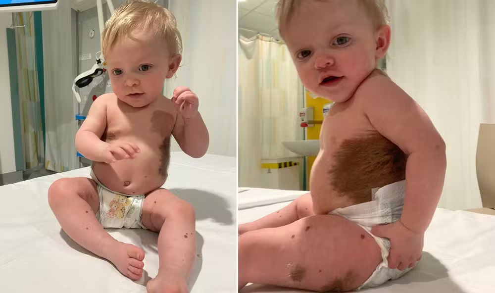 Macey-Mai, uma bebê de 10 meses, foi diagnosticada com Nevo Melanocítico Congênito Gigante, uma condição rara que aumenta o risco de melanoma, o que gerou grande preocupação na família após a descoberta das manchas na pele da criança.