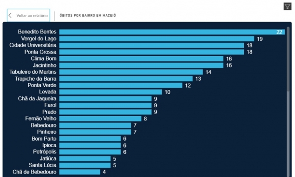 Benedito Bentes e Vergel do Lago possuem o maior número de mortes pelo novo coronavírus em Maceió. Com 22 e 19 óbitos, respectivamente, os bairros estão inseridos na classificação mais crítica (5ª faixa) do mapa contido no Painel Covid-19 de Alagoas, elaborado pela Secretaria de Planejamento e Gestão (Seplag) e que tem como base dados da Secretaria de Estado da Saúde (Sesau) e do Instituto Brasileiro de Geografia e Estatística (IBGE).