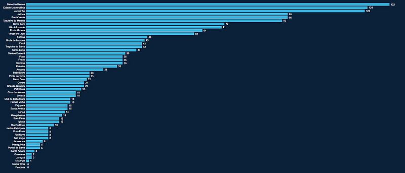 Os três bairros com menos registros de casos de Covid são Mutange (38), Pescaria (74) e Santo Amaro (97). Já os que apresentam menos mortes são Pescaria (0), Garça Torta (0) e Mutange (1).