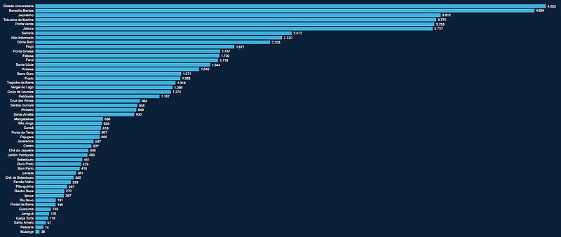 Segundo o relatório da Sesau, Cidade Universitária tem 4.802 casos de Covid confirmados, seguido pelo Benedito Bentes, com 4.694. Jacintinho (3.812), Tabuleiro dos Martins (3.770), Ponta Verde (3.753) e Jatiúca (3.737) aparecem logo em seguida. Veja a lista completa na imagem abaixo.