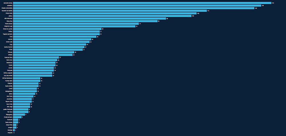 De acordo com o ranking de óbitos, o bairro Benedito Bentes aparece em primeiro lugar, com um total de 152 mortes confirmadas. Em seguida vem o Jacintinho, que registrou 146 mortes, Cidade Universitária (142), Tabuleiro dos Martins (114) e Ponta Verde, com 108 vítimas. Veja abaixo a lista completa: