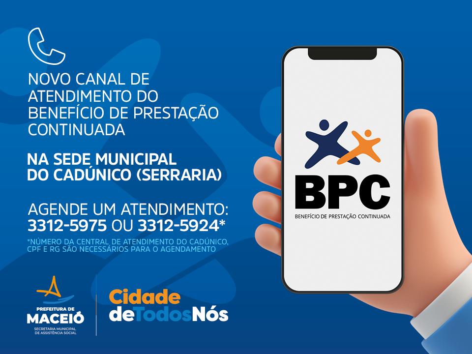 Os beneficiários do programa Benefício de Prestação Continuada (BPC) de Maceió, agora têm um novo canal de atendimento, na sede do Cadastro Único (CadÚnico), no bairro da Serraria. Para o recadastramento e concessão do benefício, os usuários poderão ligar para agendar o atendimento no 3312-5975, das 8h às 16h. Também é possível agendar o atendimento pela central do CadÚnico no 3312-5924.