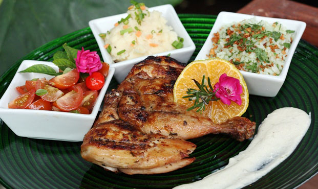Mais Boa Lembrança: frango de Marcha Lenta representa bem a cozinha da horta, com saladinha de tomate cereja e pimenta biquinho, molho de limão galego e purê de batata doce, produtos da horta do André