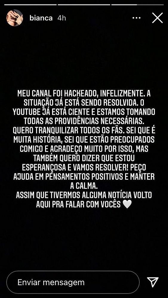 “Meu canal foi hackeado, infelizmente. A situação já está sendo resolvida. O YouTube já está ciente e estamos tomando todas as providências necessárias. Quero tranquilizar todos os meus fãs, sei que é muita história, sei que estão preocupados comigo e agradeço muito por isso”, disse Bianca.