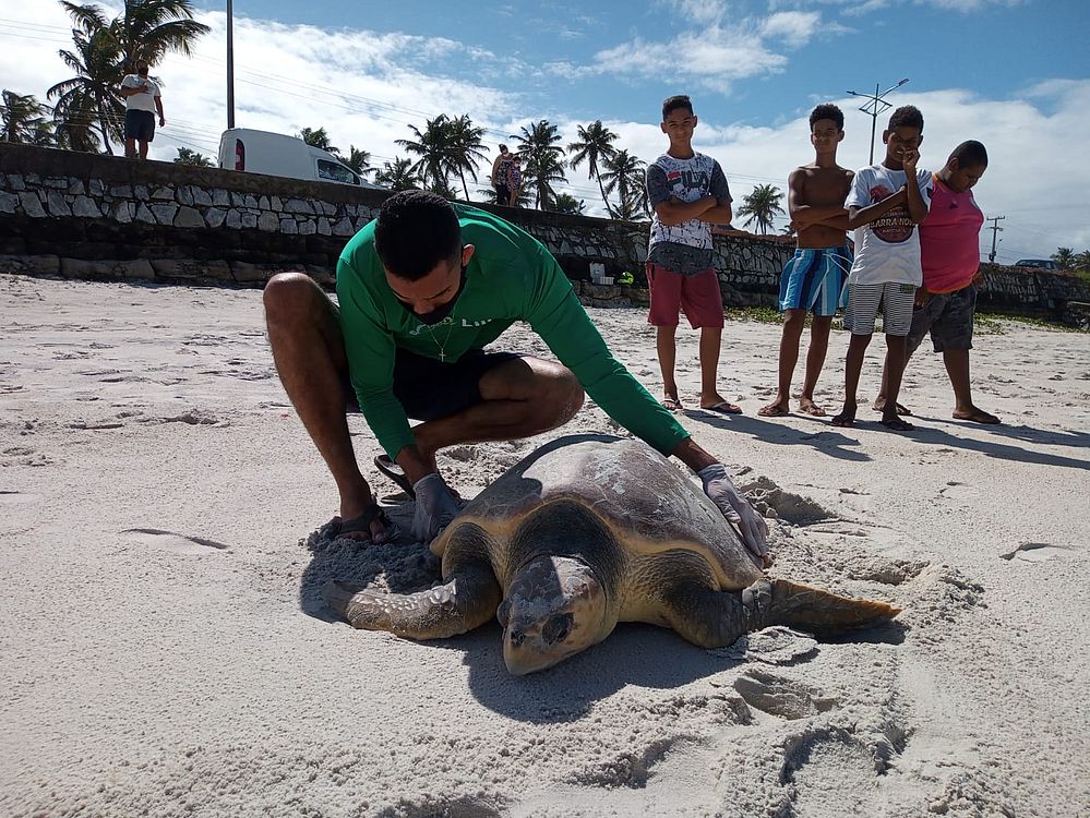 Uma tartaruga da espécie Caretta caretta, também conhecida como tartaruga-cabeçuda, foi flagrada, no final da manhã desta sexta-feira (25), na praia do Pontal da Barra, em Maceió.