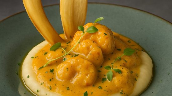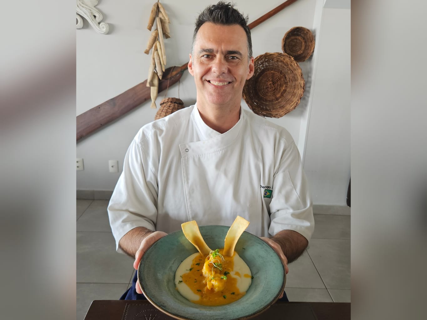 aposta numa proposta que une tradição e modernidade: o Bobó de Camarão Desconstruído. No prato, os elementos do clássico da culinária nordestina ganham uma apresentação inovadora. O purê de mandioca assume o protagonismo, acompanhado de camarões frescos, perfeitamente grelhados, e do toque aromático do azeite de dendê, que aparece de forma sutil, equilibrando sabor e leveza.