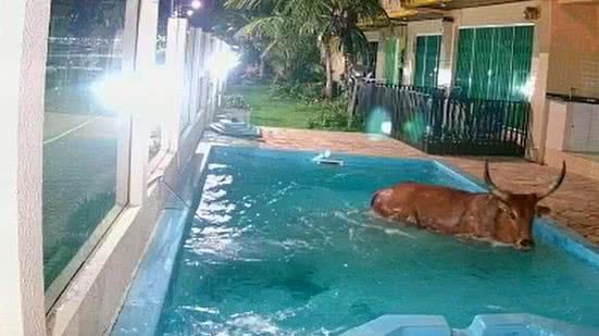 Um boi de cerca de 700 kg invadiu uma pousada e caiu dentro de uma piscina no final da noite de sábado (27), em Bombinhas, no litoral de Santa Catarina. Antes de cair na água, o animal estava sendo perseguido por um grupo de 50 pessoas que participava da Farra do Boi, evento considerado ilegal desde 1998.