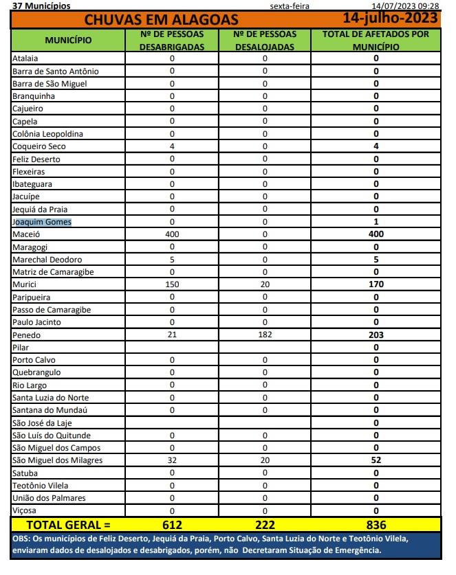 A Coordenadoria Estadual de Defesa Civil de Alagoas atualizou, na manhã desta sexta-feira (14), o número de desabrigados e desalojados no estado. De acordo com o boletim, o número baixou para 836 no final dessa semana. Na última segunda-feira o número de desabrigados e desalojados no estado chegou a 25 mil.