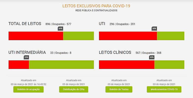 Leitos de Covid-19 do Estado – Dos 896 leitos criados pela Secretaria de Estado da Saúde (Sesau) para atender, exclusivamente, pacientes com suspeita e confirmação de infecção pelo novo coronavírus, 577 estavam ocupados até às 16 horas da quarta-feira (03/03), o que corresponde a 64% do total. Atualmente, 201 pacientes estão em leitos de UTI, oito ocupando leitos intermediários e 368 em leitos de enfermaria. Para acompanhar a evolução da ocupação dos leitos exclusivos para Covid-19, acesse http://www.alagoascontraocoronavirus.com.br/