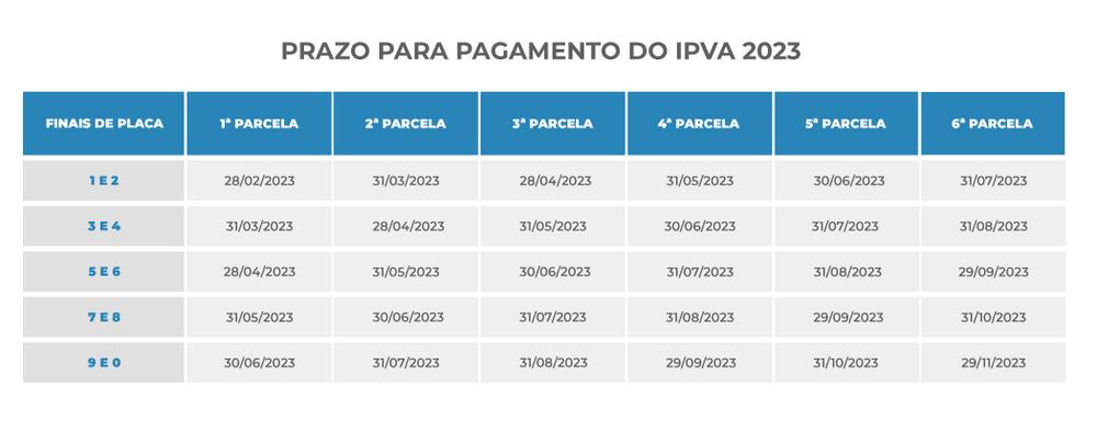 Cada final de placa possui uma data-limite para pagamento da cota única sem desconto ou da primeira parcela. As placas de finais 5 e 6 até 28 de abril; placas de finais 7 e 8 até 31 de maio e as placas de finais 9 e 0 até 30 de junho.