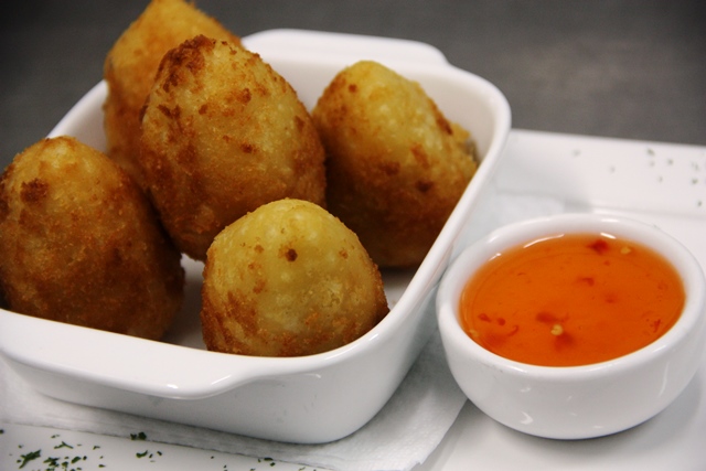 Coxinha de batata – Em vez da farinha de trigo, entra em cena a batata inglesa para preparar a massa recheada com frango. Bem legal, não tem aquela enrolação de muita massa e pouca carne. A massa fina tem conteúdo de verdade. Para acompanhar a geleia de pimenta. Detalhe todos os bolinhos são empanados com a farinha panko (japonesa).