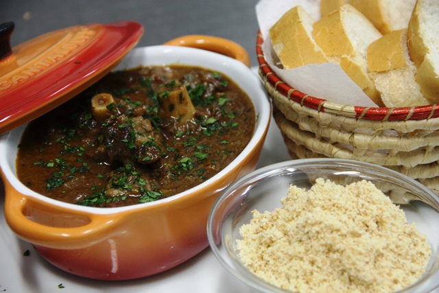 Depois de pronta, a rabada fica um tempo geladeira, onde forma uma fina camada de gordura e é descartada. Resultado: carne macia, bem temperada e o molho espesso. Para nossa alegria vem escoltada por fatias de pão e uma farofinha. Perfeito!