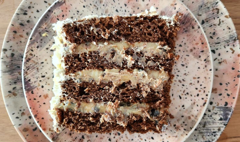 Fatia do bolo de ameixa chocolate nobre, manteiga, com recheio de três leites, e cobertura de leite Ninho