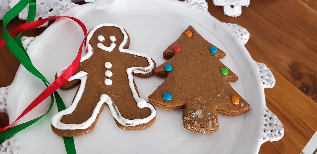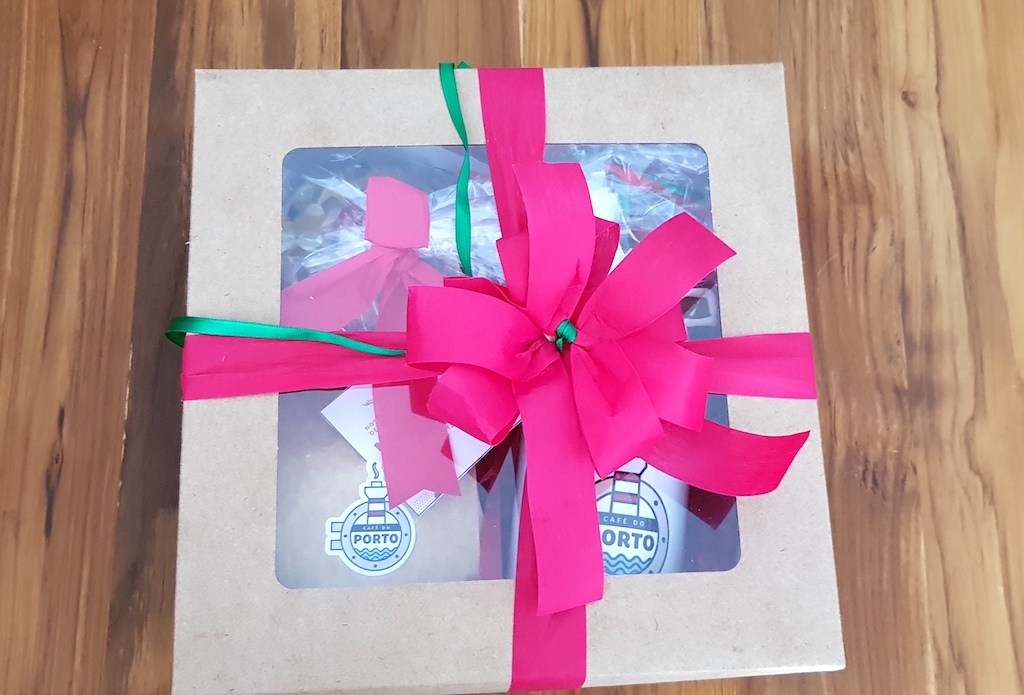 Na caixinha natalina tem os biscoitinhos de gengibre (feito com farinha de trigo e açúcar mascavo), caneca, café da marca da cafeteria e bolo de frutas. A outra opção de caixinha são os biscoitos de gengibre e as balas de caramelo