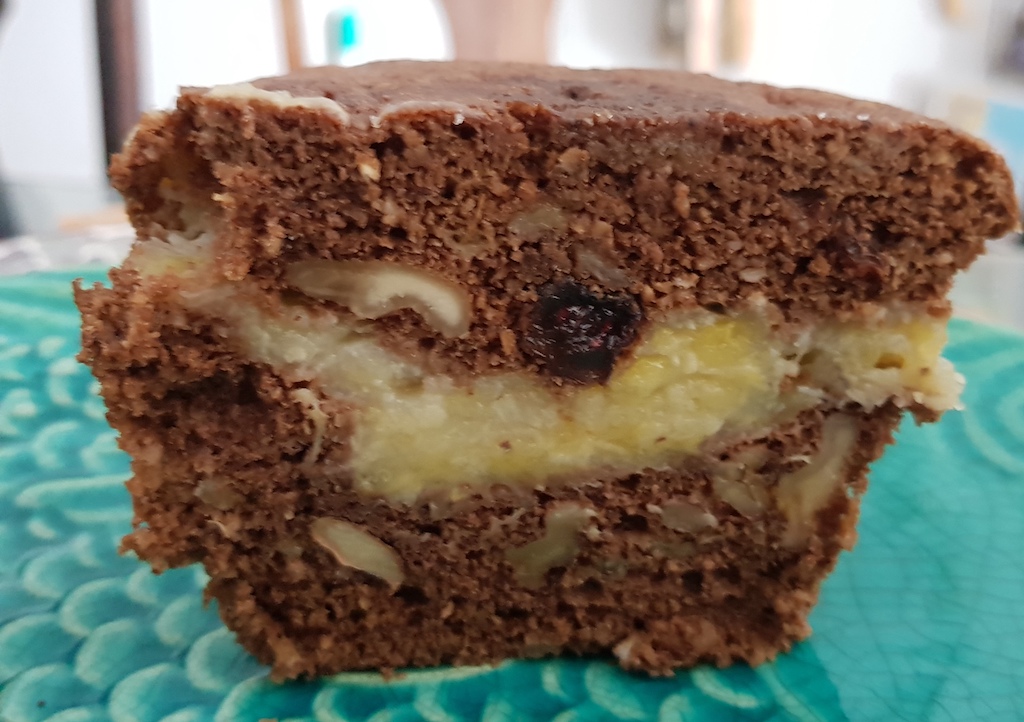 No domingo de manhã chuvoso, Flávia Monteiro deixou na portaria do meu prédio dois bolinhos zero de açúcar, de glúten e de lactose. Estavam quentinhos, e ainda tinham recheio de banana e de queijo coalho. Com café coado, provei uma fatia de cada e gostei! O doce natural, sem adoçante, apenas proveniente da mistura do mix de farinhas, grãos e o chocolate 100% cacau, agradou de cheio o meu paladar.