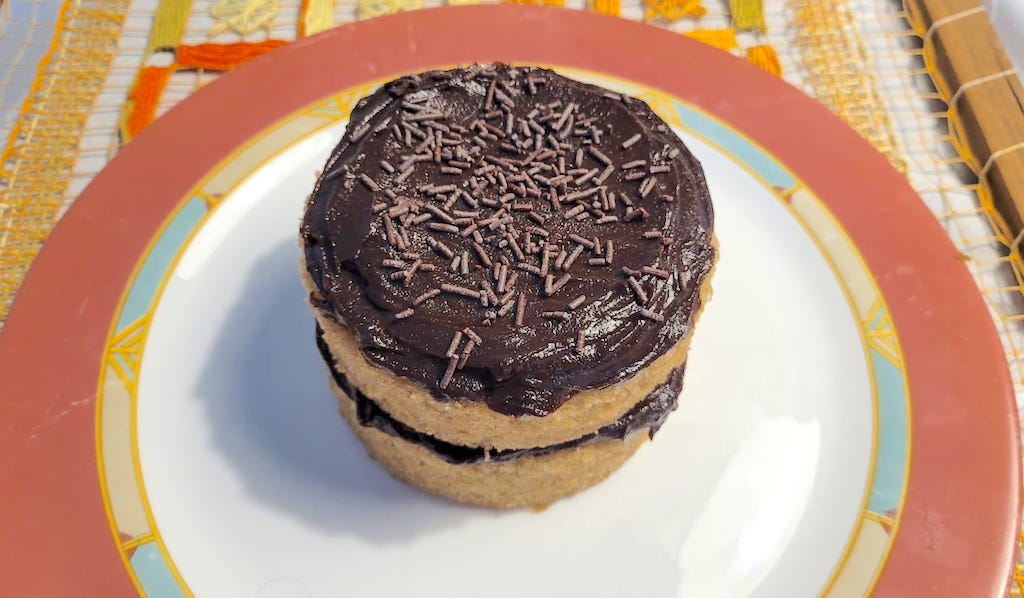 Bolo branco sem glúten e cobertura de brigadeiro a base de leite de castanha
