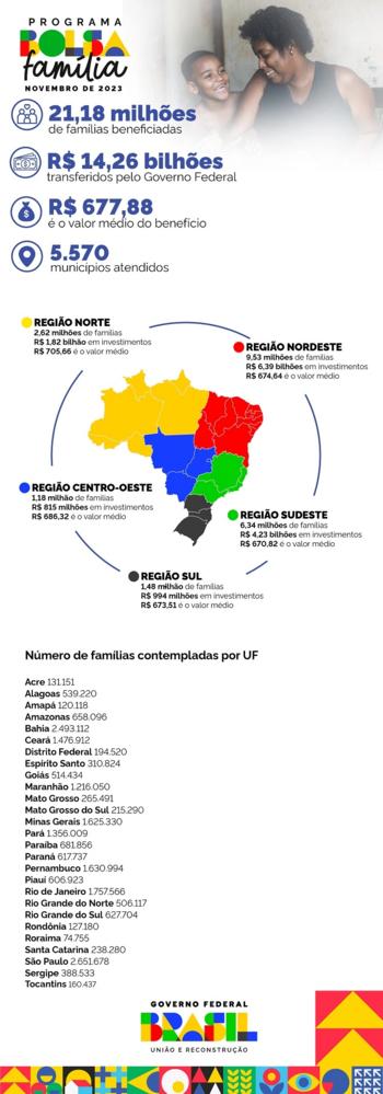 Em todos os 5.570 municípios brasileiros, 21,18 milhões de famílias recebem o Bolsa Família em novembro. O repasse total do Governo Federal chega a R$ 14,26 bilhões. Em média, cada família conta com R$ 677,88 de benefício. O valor transferido em novembro é o quarto mais alto do ano. Nos primeiros 11 meses, o Governo Federal já repassou, ao todo, R$ 155,37 bilhões pelo programa.