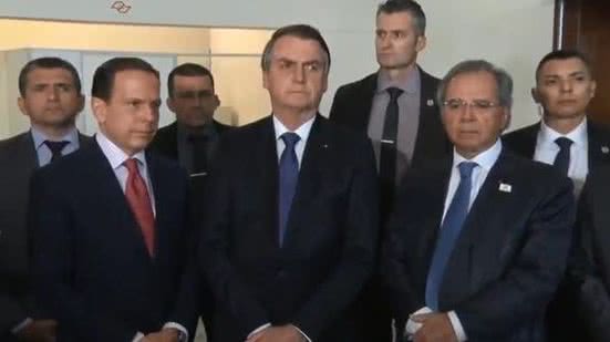 Bolsonaro estava ao lado do governador João Doria (PSDB), com quem se reuniu em uma sala do aeroporto de Congonhas para falar sobre mudanças no sistema de aposentadorias.