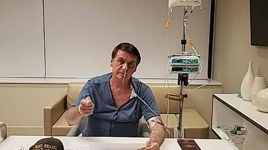 Bolsonaro faz live relâmpago em hospital, embora ainda com a sonda. Reprodução Bolsonaro está de trajes de pijama hospitalar e sentado diante de uma mesa de seu quarto no hospital. A sonda sai pelo seu nariz e ele gesticula.