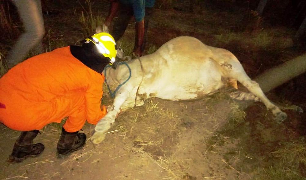 Quatro militares se envolveram no salvamento. A vaca não apresentou graves ferimentos e foi devolvida a dono.