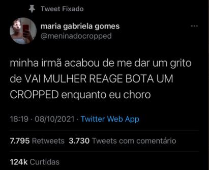 Reage, mulher, bota um croped - O meme começou no final de 2021, após Gabriela Gomes de Souza contar em um post do Twitter que estava triste após ter lavado um bolo. A irmã dela, na tentativa de animá-la, disse a frase "Vai mulher, reage e bota um cropped", que viralizaria em 2022.
