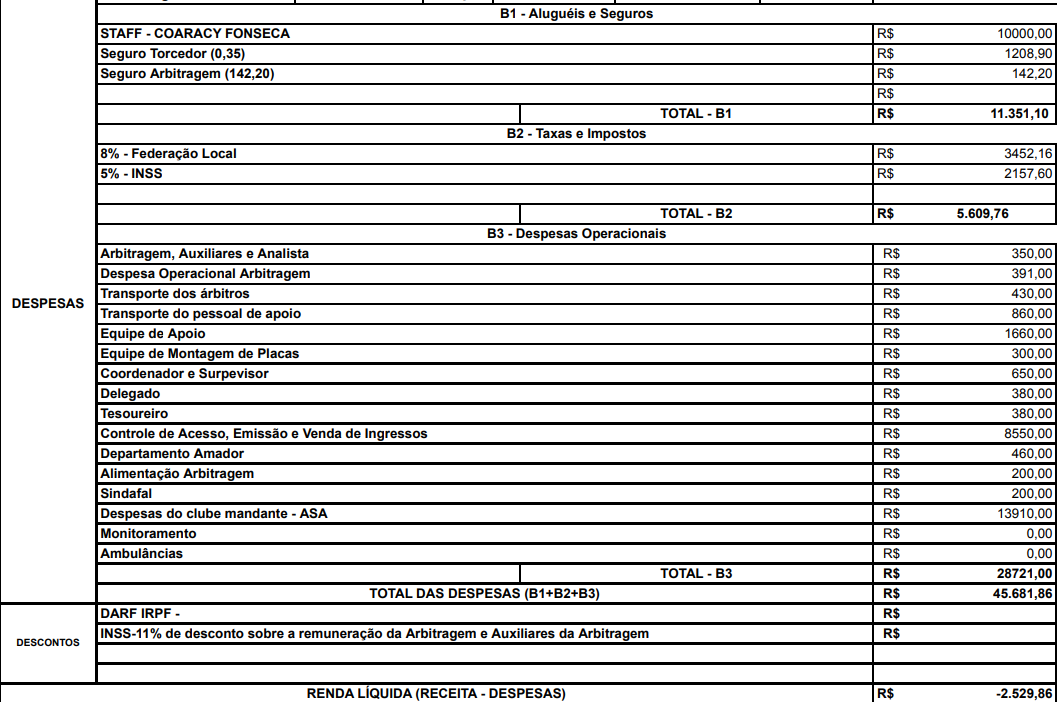 Entre os gastos estão despesas com controle de acesso e emissão de ingressos, equipe de apoio, arbitragem e outros serviços essenciais para a realização do jogo.