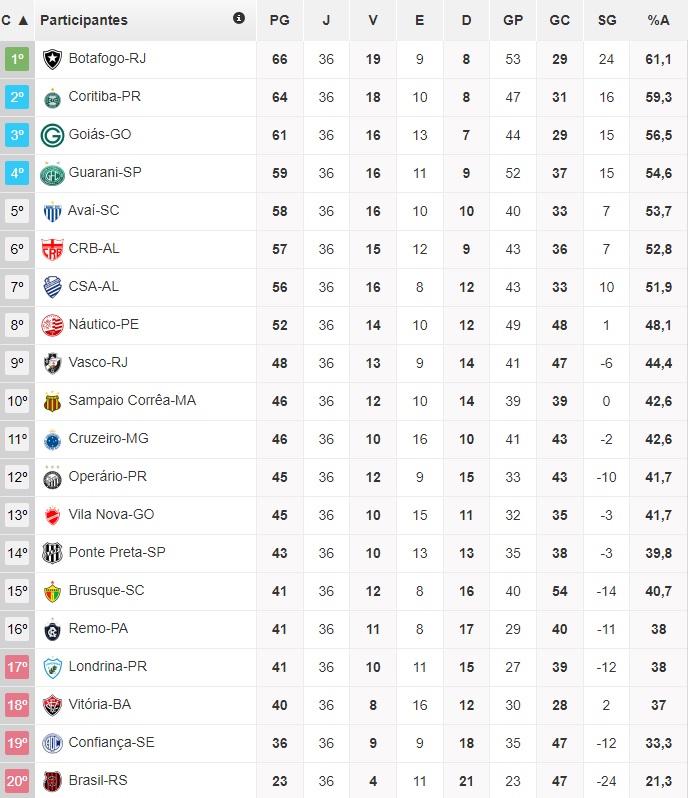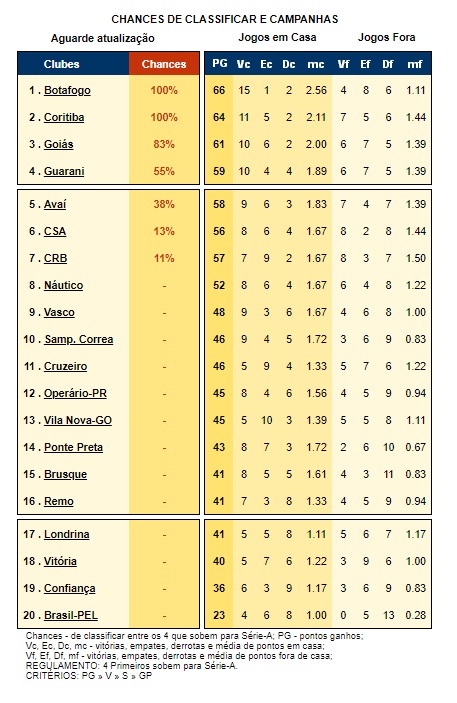 O Alvinegro venceu o Operário de virada no Nilton Santos, reassumiu a liderança com 66 pontos e não pode mais ser alcançado pelo quinto colocado. Quem também festejou antecipadamente foi o vice-líder Coxa, que bateu o Brasil-RS no Couto Pereira e chegou aos 64 pontos. Em terceiro, o Goiás derrotou o Remo fora de casa, somou 61 pontos e tem 83% de chances. Na quarta colocação, o Guarani entrou no G-4 após golear o Avaí. O Bugre foi aos 59 pontos e tem 55% de chances.