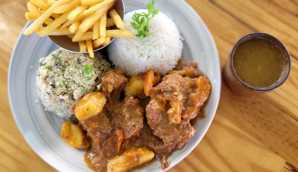 Almoço executivo: carne guisada com pirão, arroz, feijão e batatinha frita