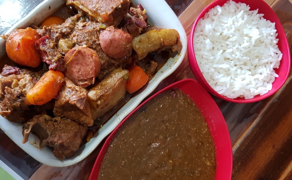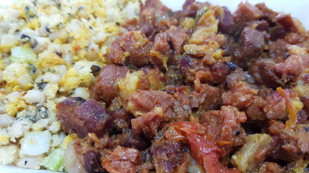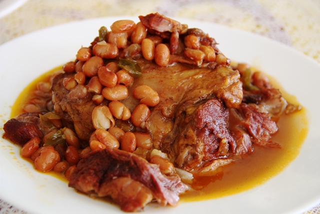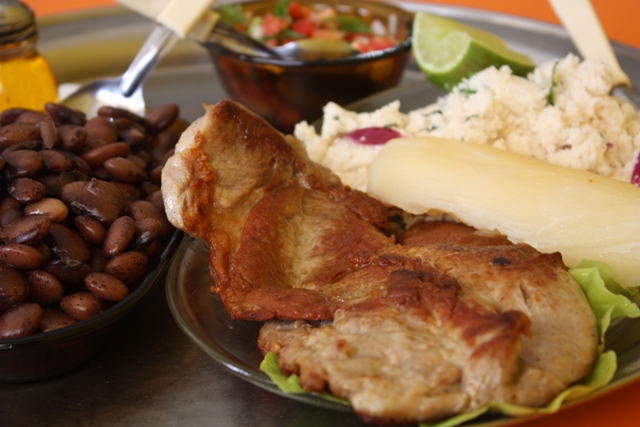 Carne de porco com fava, macaxeira, vinagrete e a farofa matuta (especialidade da casa).