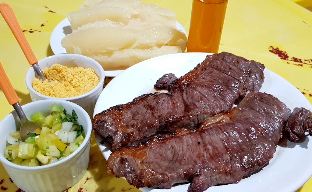 Contrafilé maturada, macaxeira, vinagrete, farofa e manteiga de garrafa