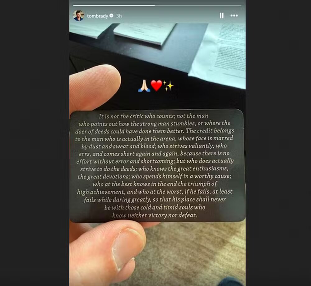 O post feito por Brady na seção Story do Instagram consiste na foto de uma plaquinha com a reprodução de uma reflexão feita pelo ex-presidente norte-americano Theodore Roosevelt (1858-1919).