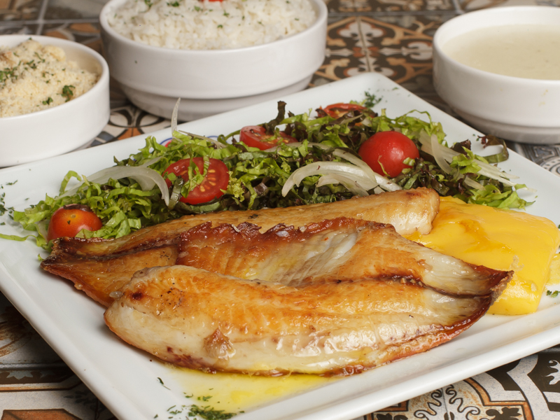 Bicho Do Mar: Filé de peixe fresco, salgado e secado por algumas horas à moda nordestina e grelhado na manteiga. Servido com queijo do sertão, arroz branco, pirão de leite, farofa de banana da terra e saladinha / R$ 59,90/ Av. Menino Marcelo, 14 R 4 Serraria