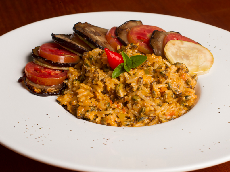 Hibiscus: Arroz cozido no próprio molho cremoso do sururu, acompanhado por ratatouille de vegetais/ R$49,00/ Rua em Projeto M Sítio São Gonçalo, A 2 Ipioca