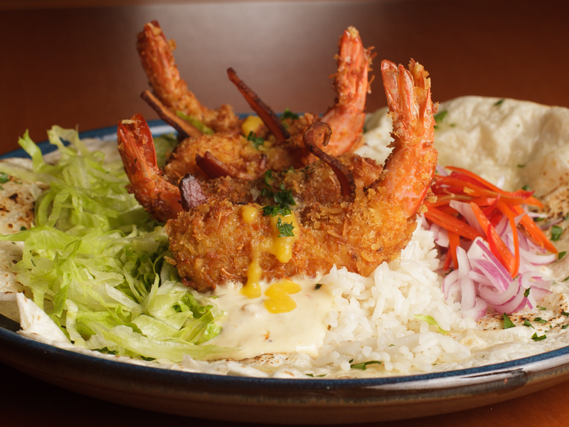 La Rosa Mexicana: Tortilla de trigo recheada com camarões empanados na farinha panko com coco ralado queimado, arroz pilaf e salsa picante de manga com bacon (Individual)/ R$45,00/ Rua Prof. Maria Esther da Costa Barros, Jatiúca