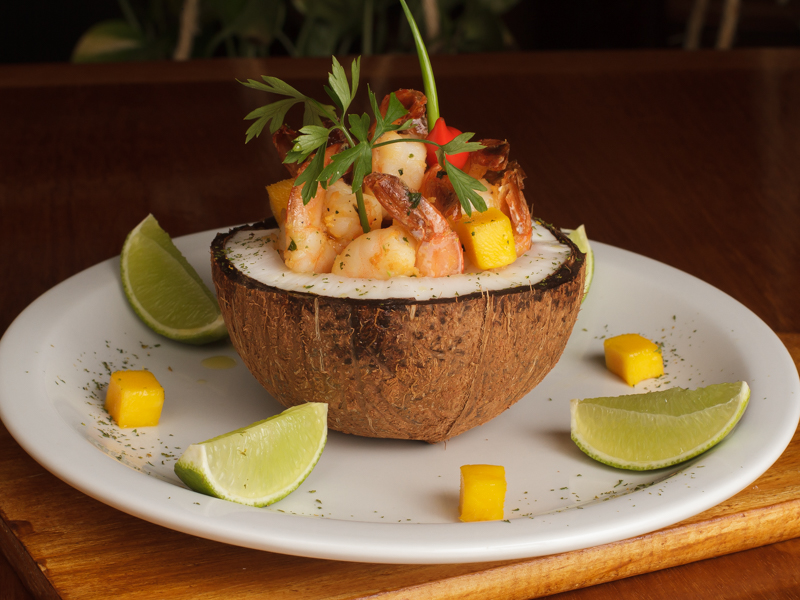 Pelo Mundo: Camarão marinado no azeite, alho, caldo delicia do mar, gengibre ralado e alecrim. Flambado no Whisky. Servido no coco, cubos de manga e limão/ R$43,90/ Av. Dr. Antonio Gomes de Barros, 1500- Jatiúca