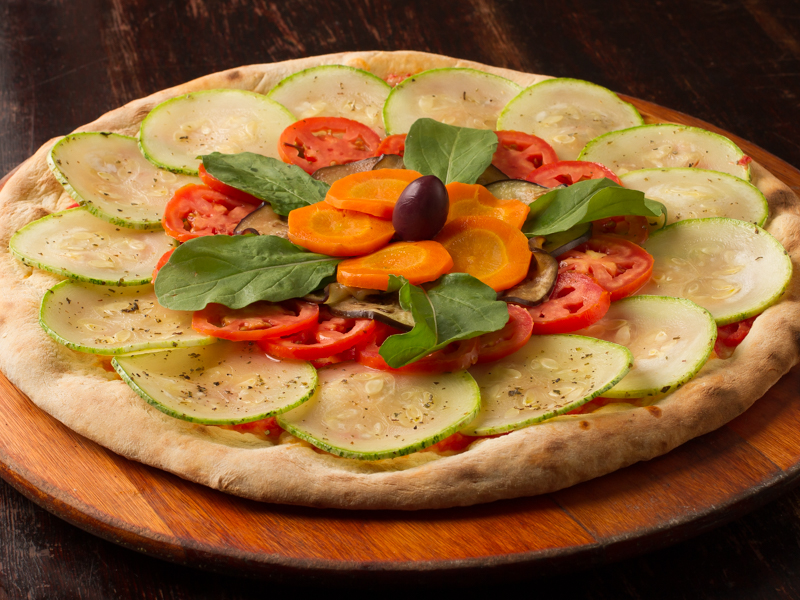 Sabatelli Pizza E Arte: Pizza no molho pomodoro, legumes refogados no azeite (abobrinha, beringela e cenoura) tomate em rodelas, rúcula e azeitona/ R$55,90/ Rua Desp. Humberto Guimarães, Ponta Verde
