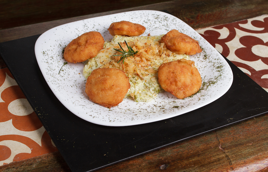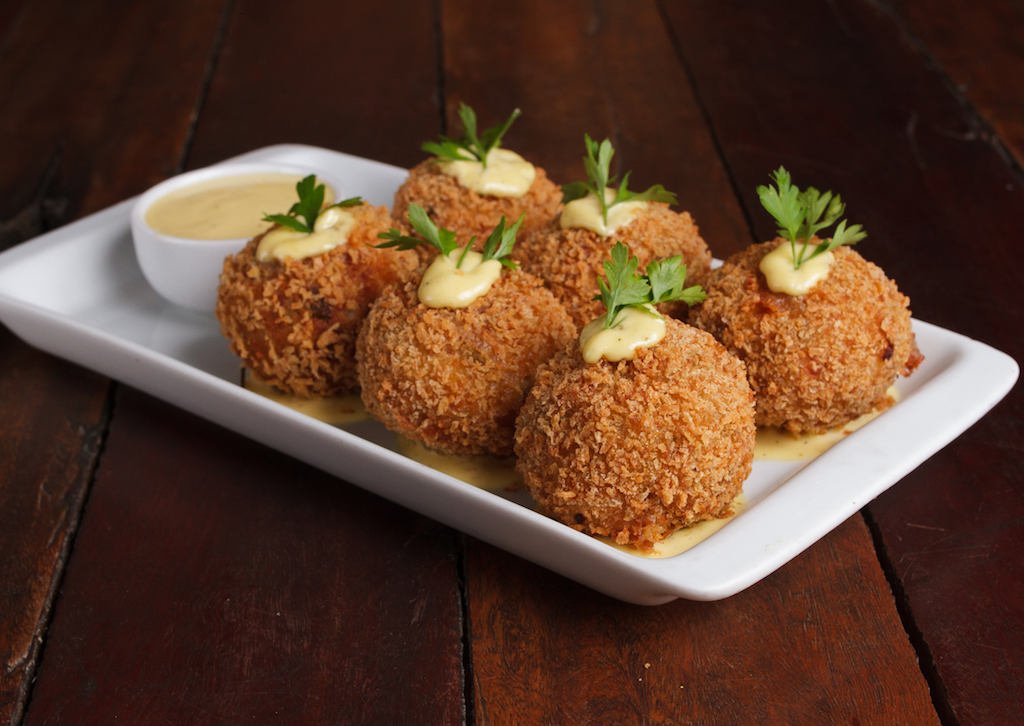 Delicioso bolinho de charque com feijão de corda verde, manteiga de garrafa, nata, linguiça, queijo coalho e coentro empanado na farinha panko. Para acompanhar, molho de alho. Av. Dr. Júlio Marques Luz, 62 – Jatiúca/ (82) 3327-4446
