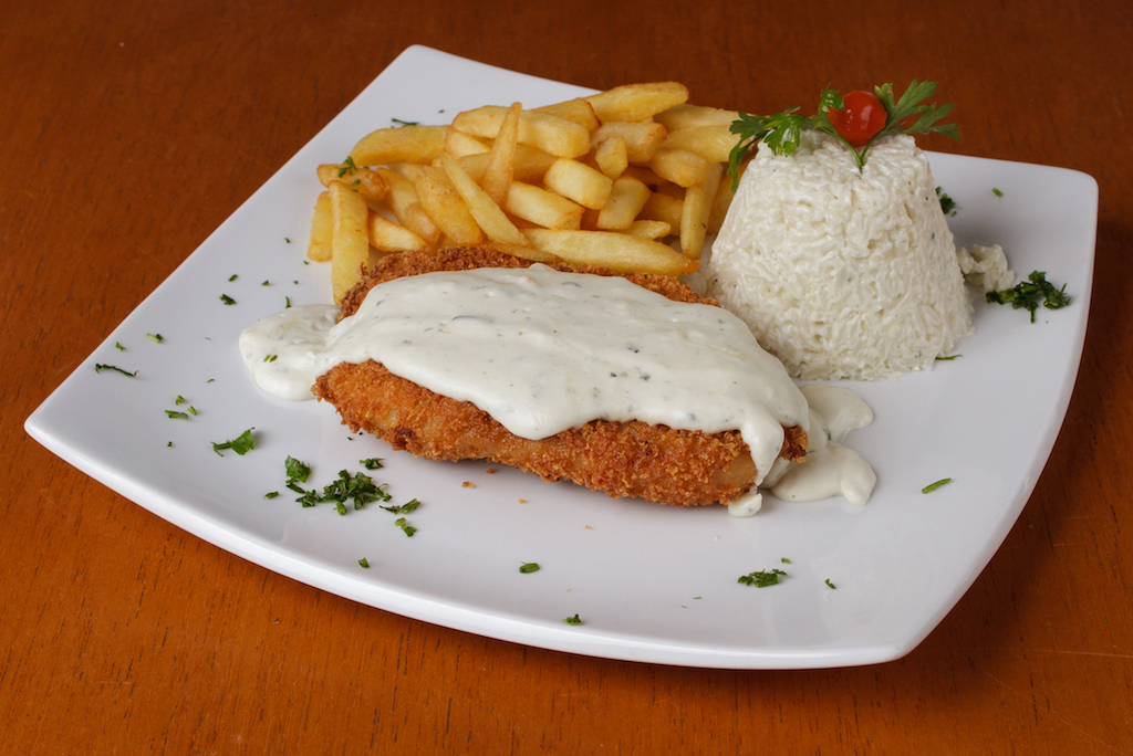 Peixe crocante empanado na farinha panko e parmesão, e frito. Acompanha batata, arroz e molho de gorgonzola. Av. Dr. Antônio Gouveia, 15 – Pajuçara/ (82) 98208-4427