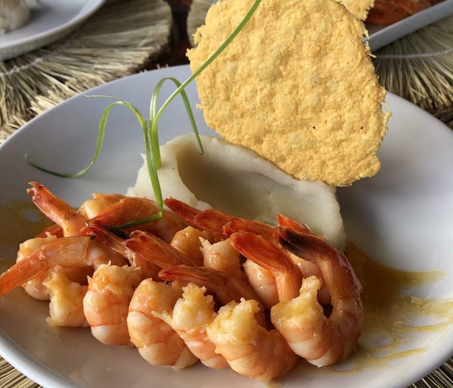Camarões refogados na manteiga de garrafa com creme de macaxeira. Finalizado com queijo coalho maçaricado e macaxeira palha. Residencial Angra de Ipioca, AL-101 – Ipioca/ (82) 3142-0910