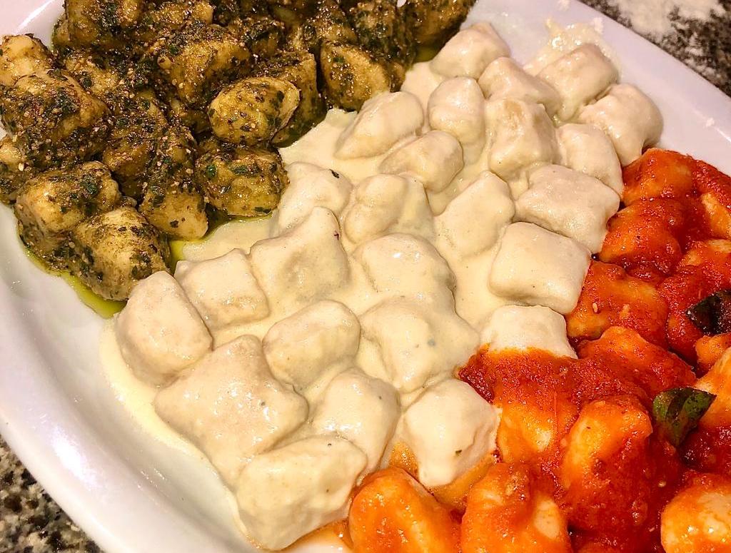 Nhoque de três molhos diferentes, com as cores da Itália – pesto (verde), quatro queijos (branco) e pomodoro (vermelho). 56, Rodovia, AL-101 – Riacho Doce/ (82) 3355-1222