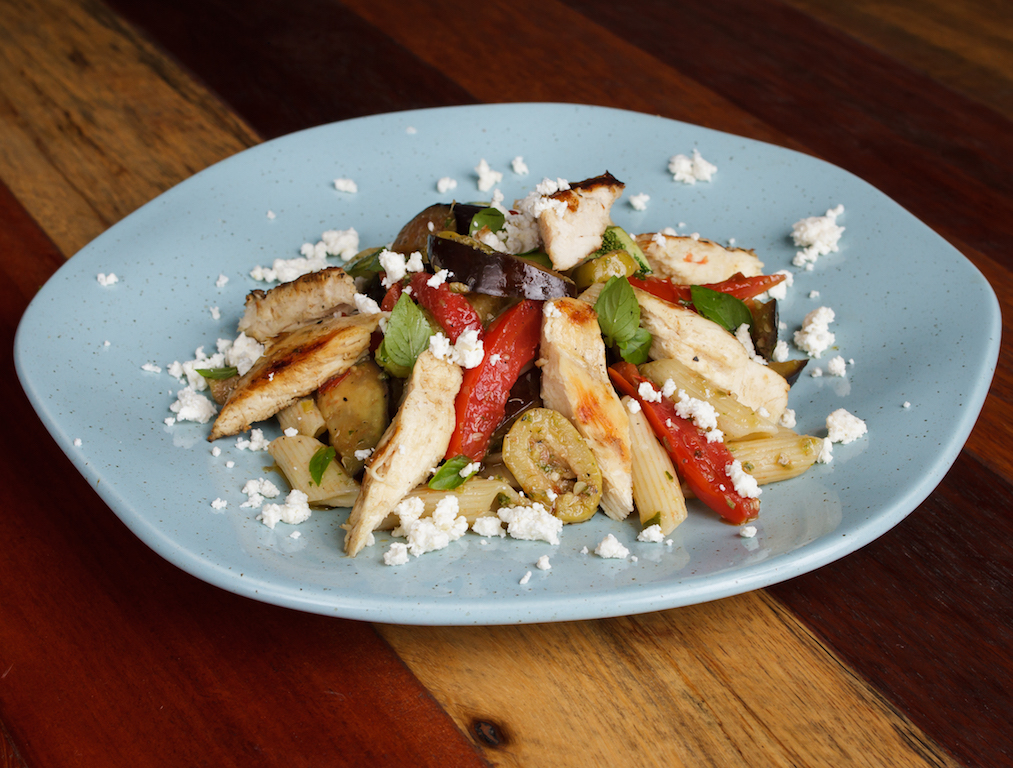 Penne com legumes caramelizados no azeite e molho pesto, servido com lascas de frango grelhado e ricota fresca ralada. Av. Silvio Carlos Viana, 2501 – Ponta Verde/ (82) 3305-4405