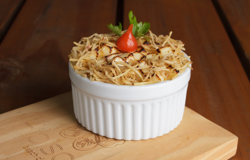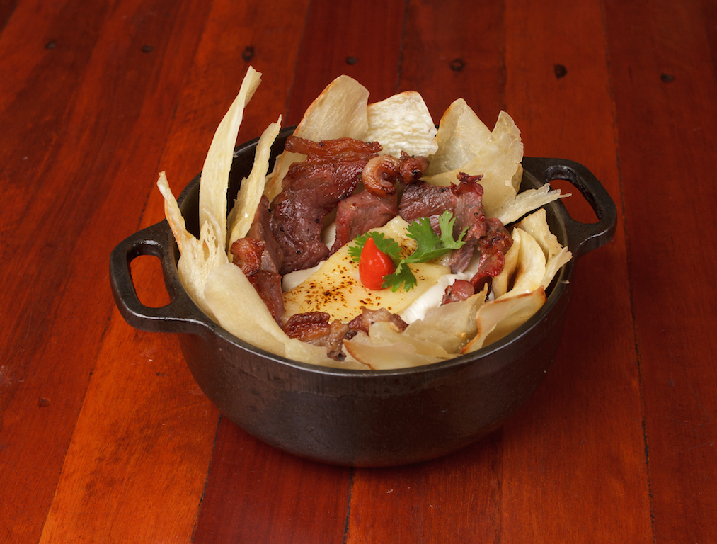 Chips de macaxeira com creme de queijo fondue e carne de sol de contra-filé em cubos. Av. Dr. Antônio Gouveia, 487 – Pajuçara/ (82) 3313-4011